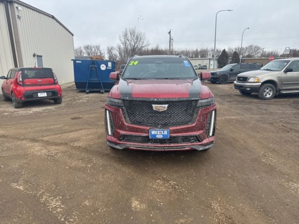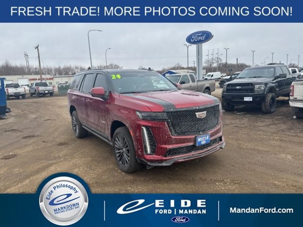 Experience the ultimate blend of luxury and performance with this 2024 Cadillac Escalade V Series finished in stunning Radiant Red Tintcoat. Powered by a thrilling supercharged 6.2L V8 and equipped with all wheel drive, this high performance luxury SUV delivers breathtaking power and confident capability. Inside you will find premium Dark Auburn and Jet Black accent leather seats, heated and cooled front seats, heated rear seats, and spacious third row seating with middle row buckets for outstanding comfort. The dual pane panoramic moonroof adds an open airy feel while advanced technology includes navigation, Apple CarPlay, Android Auto, Bluetooth handsfree phone, Blue Cruise hands free driving capability, and a premium sound experience. Safety features include adaptive cruise control, blind spot alert, lane keep assist, park assist, reverse sensing system, and a 360 camera. This one owner accident free local trade in Escalade is unforgettable. Call today to schedule your private test drive.