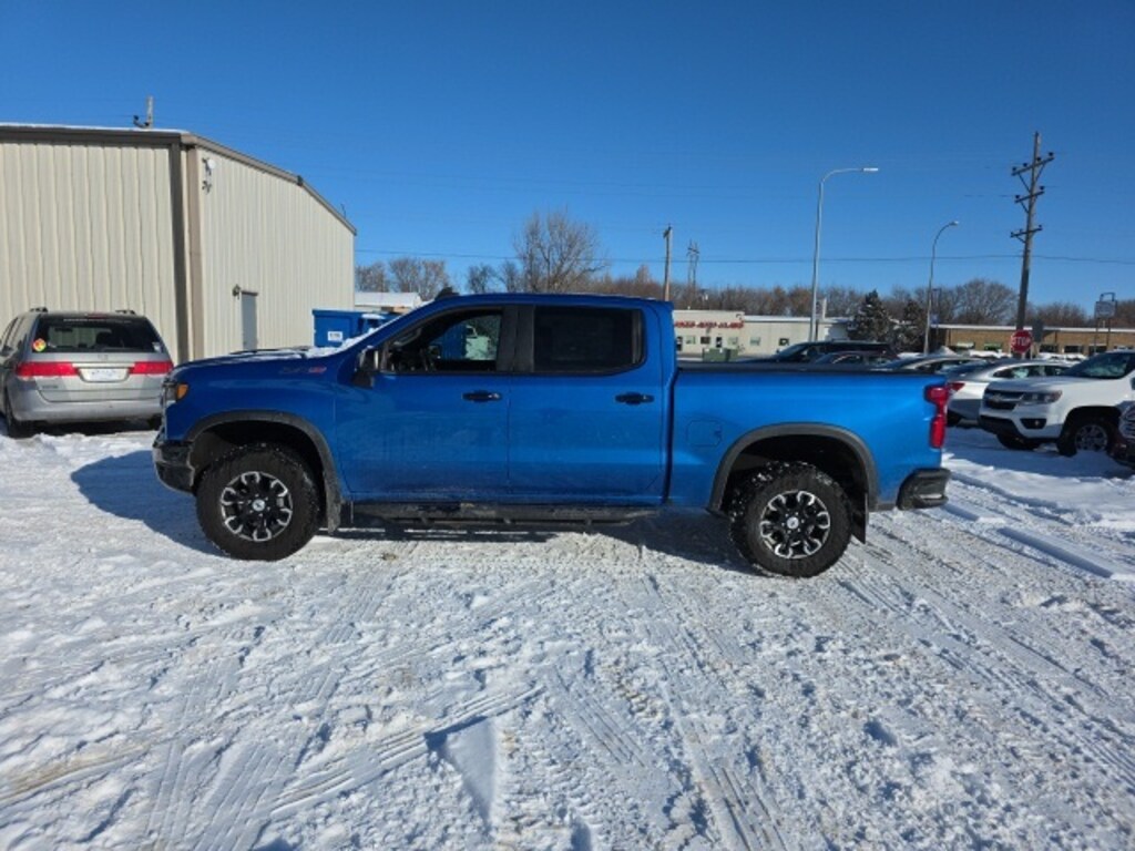 The 2022 Chevrolet Silverado ZR2 Crew Cab delivers rugged capability, advanced safety, and premium technology in a bold off-roadready package. Chevrolet Safety Assist provides confidence with Automatic Emergency Braking, Forward Collision Alert, Lane Keep Assist, Front Pedestrian Braking, and IntelliBeam headlights. Off-road performance is enhanced by a driver-selectable full-locking rear differential, Autotrac 2-speed transfer case, and Goodyear Wrangler Territory tires. Inside, a 13.4" HD touchscreen with Google Built-In, wireless Apple CarPlay/Android Auto, and a 12.3" digital driver display keep you connected. Comfort features include dual-zone climate control, heated front bucket seats, and a heated leather-wrapped steering wheel. Exterior highlights include LED lighting, a power-up/down tailgate, CornerStep bumper, and power-folding heated mirrors, all finished in striking Glacier Blue Metallic.