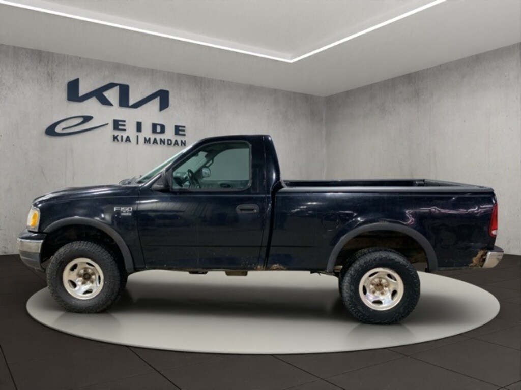 The 1999 Ford F-150 XL Reg Cab 4x4 in Black is a rugged and dependable pickup designed for both work and adventure. Powered by a 4.2L EFI V6 engine paired with a 4-speed automatic transmission with overdrive, it delivers reliable performance on and off the road. Its 4x4 drivetrain, 2-speed transfer case, and 8-foot pickup box with tie-down hooks provide versatility for hauling and towing, supported by a 3800 lb rear axle and 3900 lb front axle. Safety features include dual front airbags, adjustable seat belts, and side door intrusion beams. The interior is practical with a color-keyed headliner, dual cupholders, auxiliary power, and comprehensive gauges. Additional highlights include power steering, front disc/rear drum brakes, gas-pressurized shocks, and a crank-type spare tire carrier for durability and convenience.