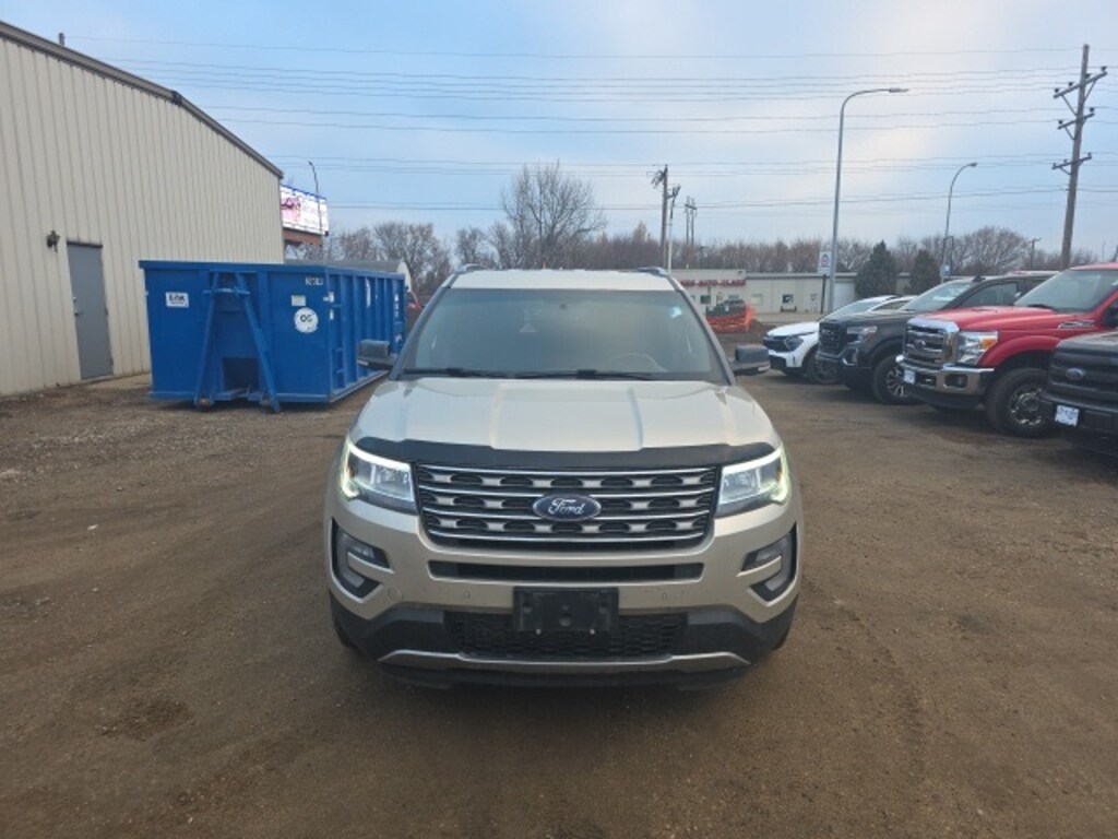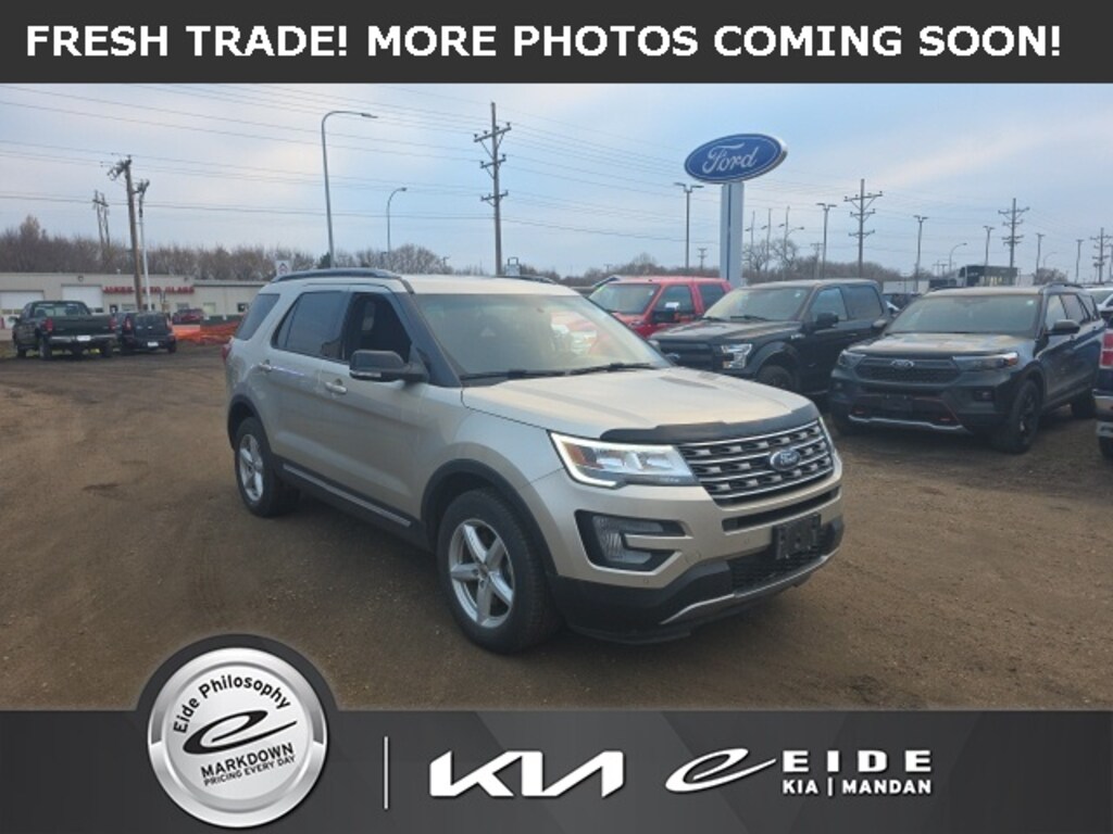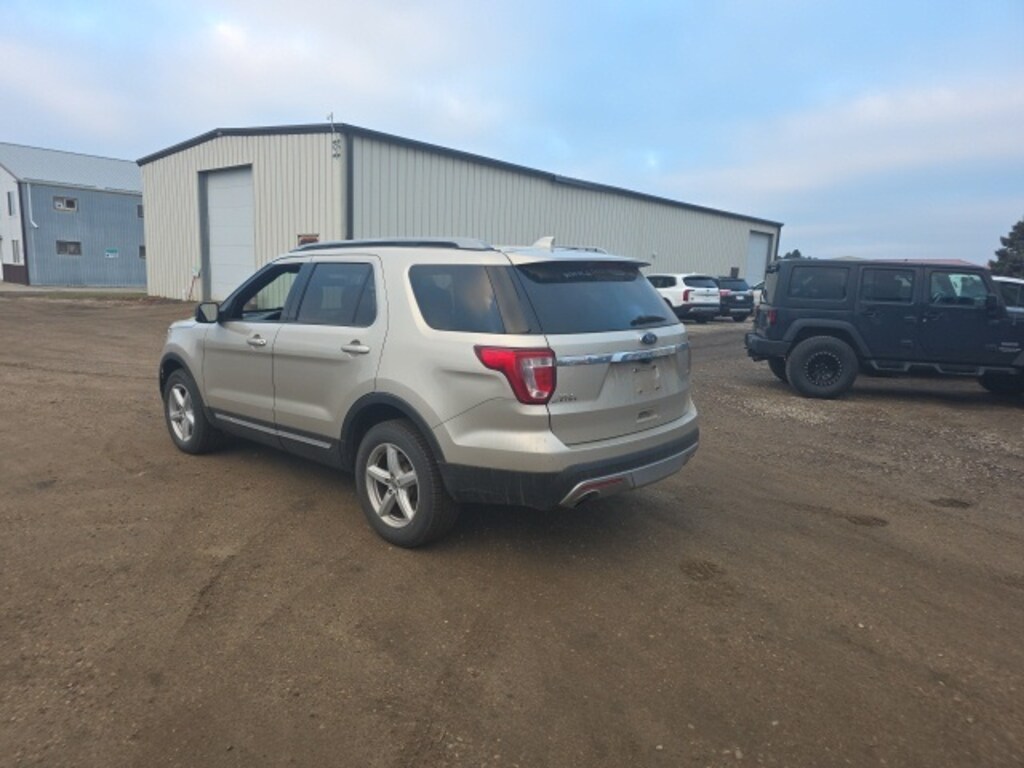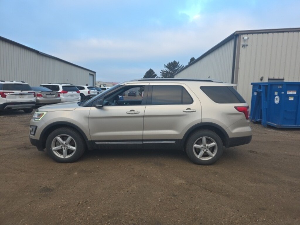 The 2017 Ford Explorer XLT 4WD is a versatile SUV with a 112.6" wheelbase, powered by a 2.3L EcoBoost engine paired with a 6-speed automatic transmission. Its exterior features white gold metallic paint, body-colored door handles, LED headlights, fog lamps, roof racks, and trailer sway control. Inside, the ebony black cloth interior offers a 1-touch up/down driver/passenger window, fold-flat rear seats, leather-wrapped steering wheel, cruise control, dual USB/power outlets, and a 10-way power driver seat. Standard technology includes SYNC 3, premium 9-speaker audio, remote start, and hands-free tailgate access. Safety features include airbags, ABS brakes, hill-start assist, MyKey, and rearview camera. Optional packages enhance comfort with heated steering wheel, cold-weather package, and advanced driver-assist systems. The SUV also offers alloy wheels and BLIS for convenience and safety.