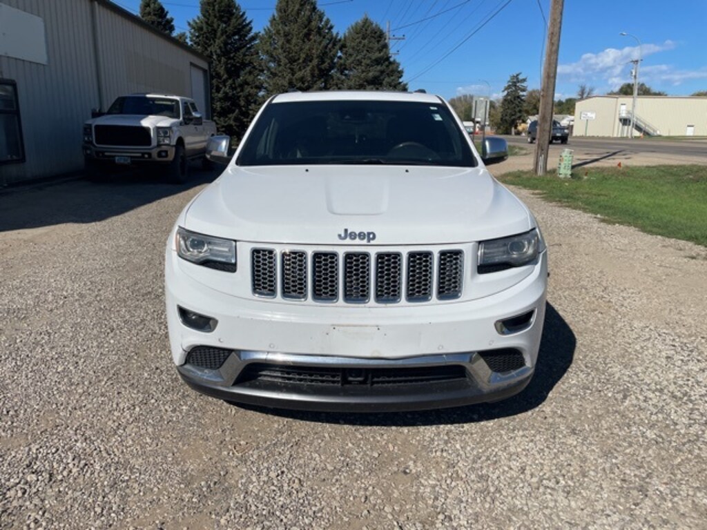 The 2014 Jeep Grand Cherokee Summit is a luxury 4x4 SUV that combines powerful performance with advanced technology and comfort. Under the hood, it features a robust 5.7L V8 engine with Quadra-Drive II 4WD, an 8-speed automatic transmission, electronic limited-slip differential, and class IV towing equipment with trailer sway control. Safety is comprehensive, including forward and rear collision warning, blind spot monitoring, park assist with front and rear sensors, rearview camera, adaptive cruise control, and full airbag coverage. The interior impresses with heated and ventilated leather seats, a heated leather/wood steering wheel, dual-zone automatic climate control, and premium leather/wood trim. Entertainment includes Uconnect 8.4AN touchscreen with navigation, Bluetooth, and dual LCD monitors. Exterior highlights include a panoramic sunroof, 20-inch polished aluminum wheels, LED lighting, roof rails, and power liftgate.